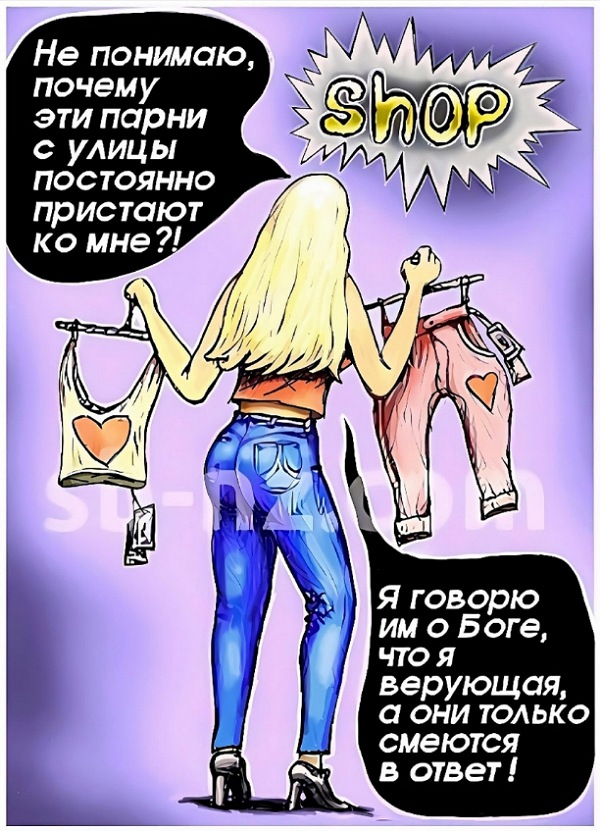 На рисунке: "Не понимаю, почему эти парни с улицы вечно пристают ко мне?! Я говорю им о Боге, что я верующая, а они только смеются в ответ!"