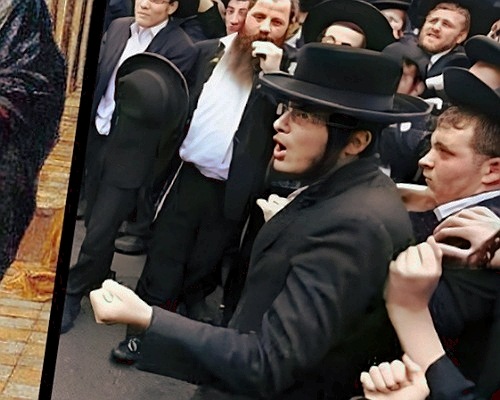 На изображении фрагмент картины Эль Греко "Исцеление слепорожденного" (1567) и фотография талмудических радикалов. Пояснение: Сын Божий исцелил слепого в субботу и совершал в эти дни другие добрые дела, уча Своих последователей делать то же самое. Однако, современные радикальные евреи, не повинующиеся Христу, готовы забрасывать камнями прохожих или автомобили, если считают, что те как либо нарушают субботу