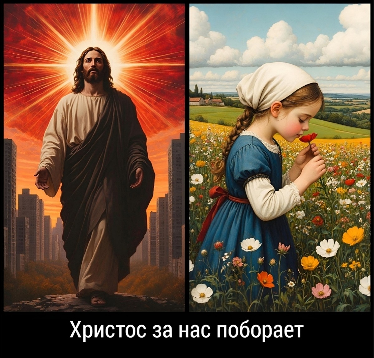 На картинке: Христос в современном городе и девочка разглядывающая цветы (сделано инструментами ИИ). Подпись: "Христос за нас поборает". Пояснение: если в человеке живёт Христос, то его дела будут добрыми, как написано: "По плодам их узнаете их... (От Матфея 7:16)"