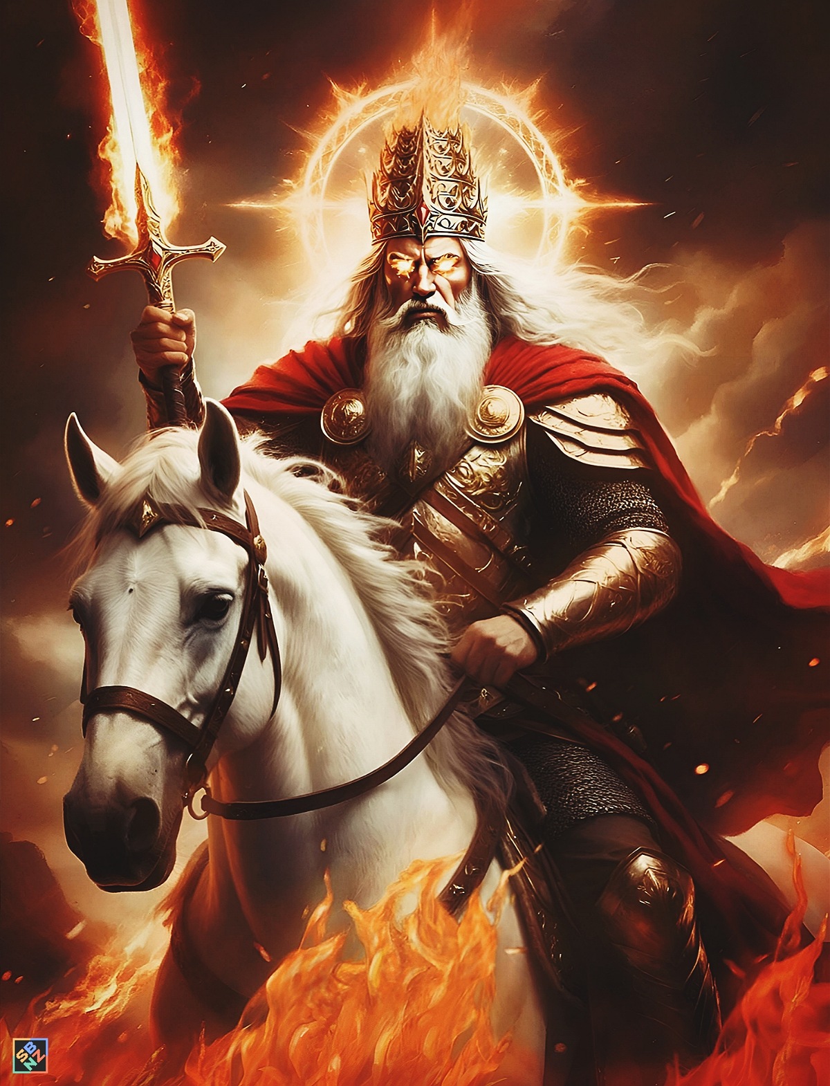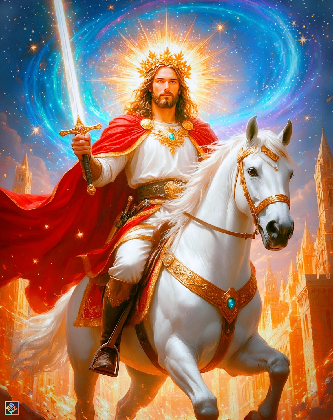 "И увидел я раскрытые небеса и всадника на белом коне. Всадника звали Верный и Истинный.. Он справедливо судит и ведёт войну. … Он одет в плащ, обагрённый кровью, и имя Его – Слово Всевышнего.. За Ним следует небесное войско, всадники на белых конях, одетые в тончайшую льняную одежду, чистую и белую… Затем я увидел зверя и царей земли с их войсками. Они собирались на битву со Всадником на коне и с Его армией (Откровение 19:11,13-14,19; в/п)".