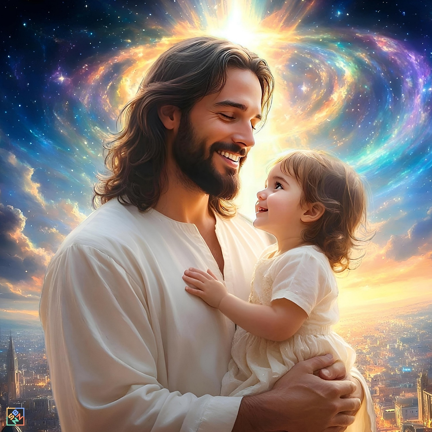 На следующей картинке нейроробот изобразил Христа в образе славного всадника в Небесном городе. Библия описывает это место как сияющий город из золота и драгоценных камней – там нет теней, потому что в этом городе нет солнца, вместо него Сам славный Господь освещает Своей вечной славой это удивительное место во Вселенной, потому что Бог есть свет, и нет в Нём никакой тьмы.