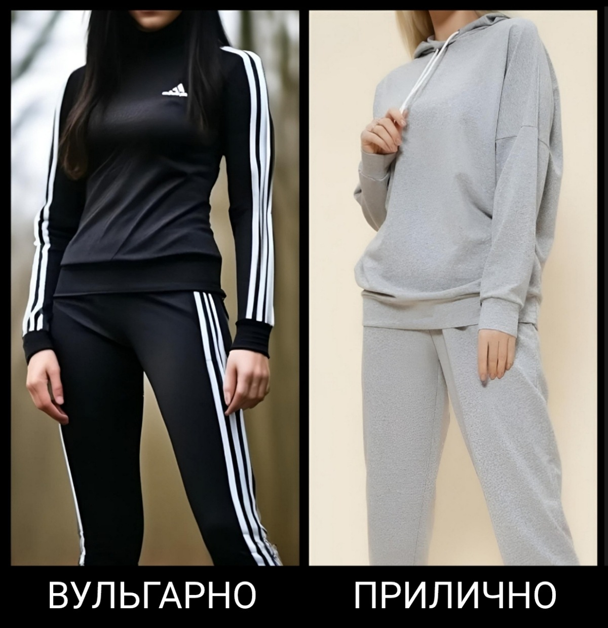 На картинке одежда для физкультуры. Подпись: "вульгарно"; "прилично"