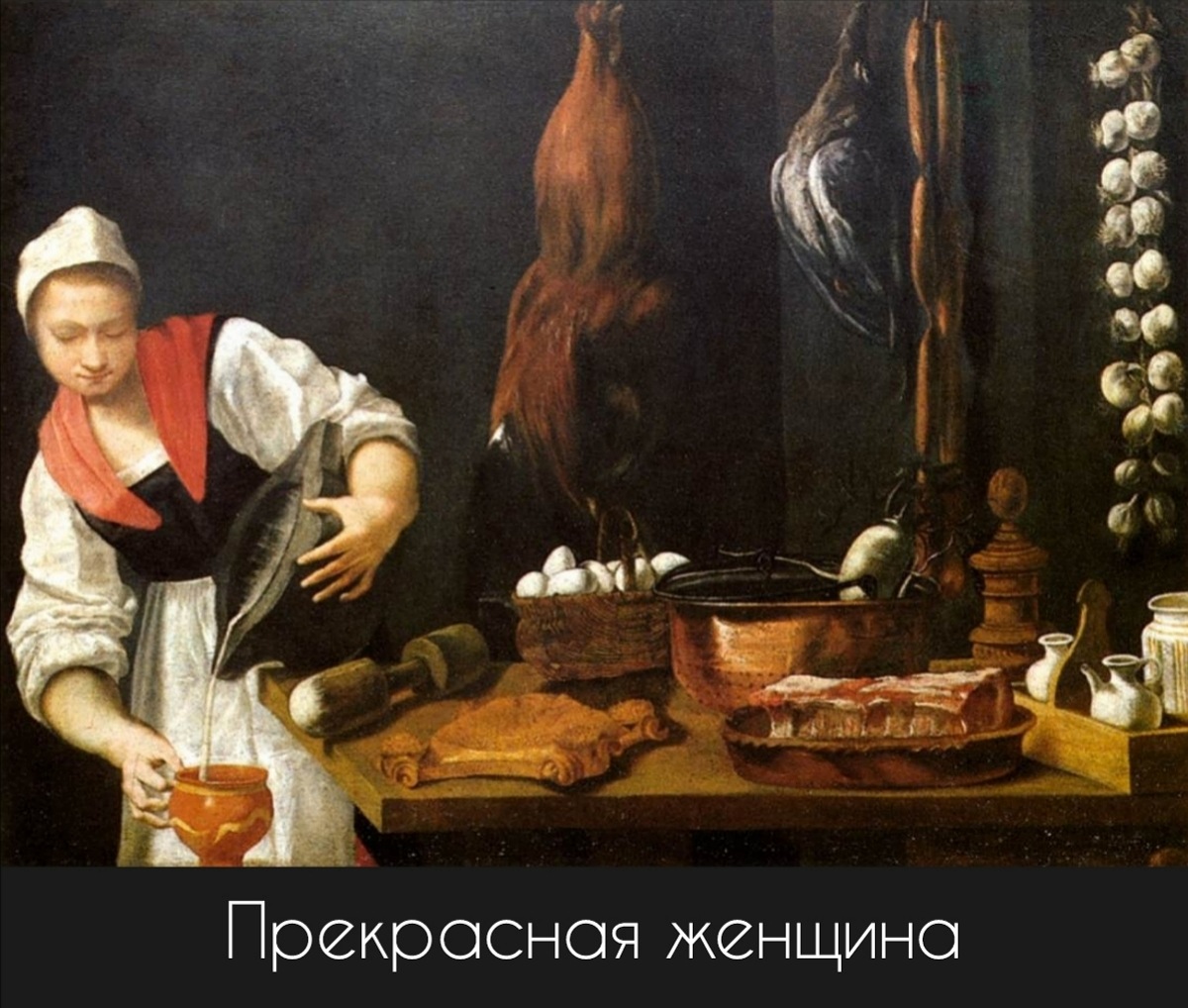 Репродукция картины Andrea Commodi, "Молодая женщина на кухне" (XVII ст.). Подпись: "Прекрасная женщина". Пояснение: женщина, послушная Богу и служащая своей семье прекрасна