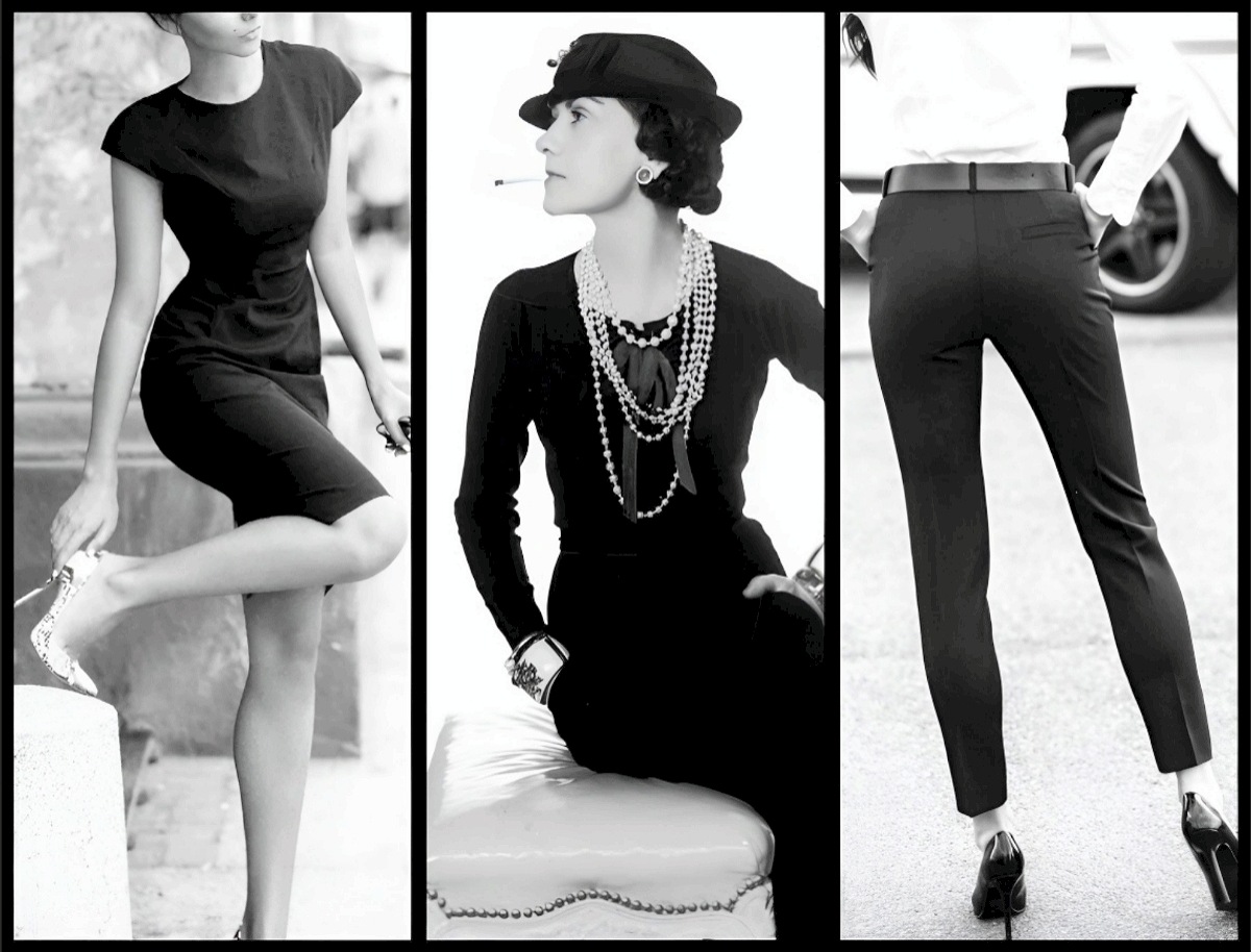 На картинке: Коко Шанель и её дерзкие для своего времени идеи – маленькое чёрное платье и брюки для женщин, сшитые по принципу мужских