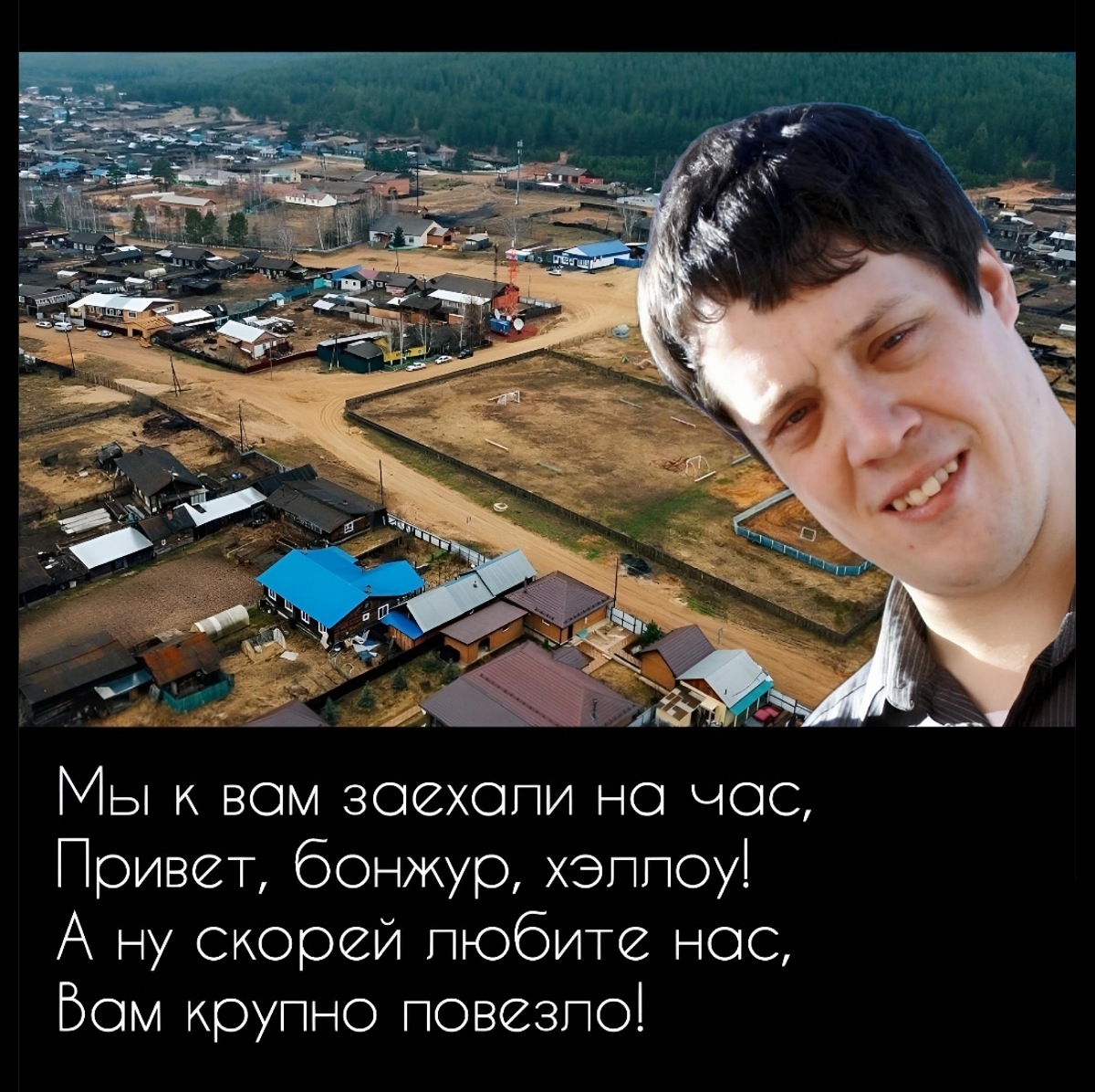 На картинке фото посёлка Осиновый Мыс и Джастаса Уолкера. Подпись: "Мы к вам заехали на час, Привет, бонжур, хэллоу! А ну скорей любите нас, Вам крупно повезло!"