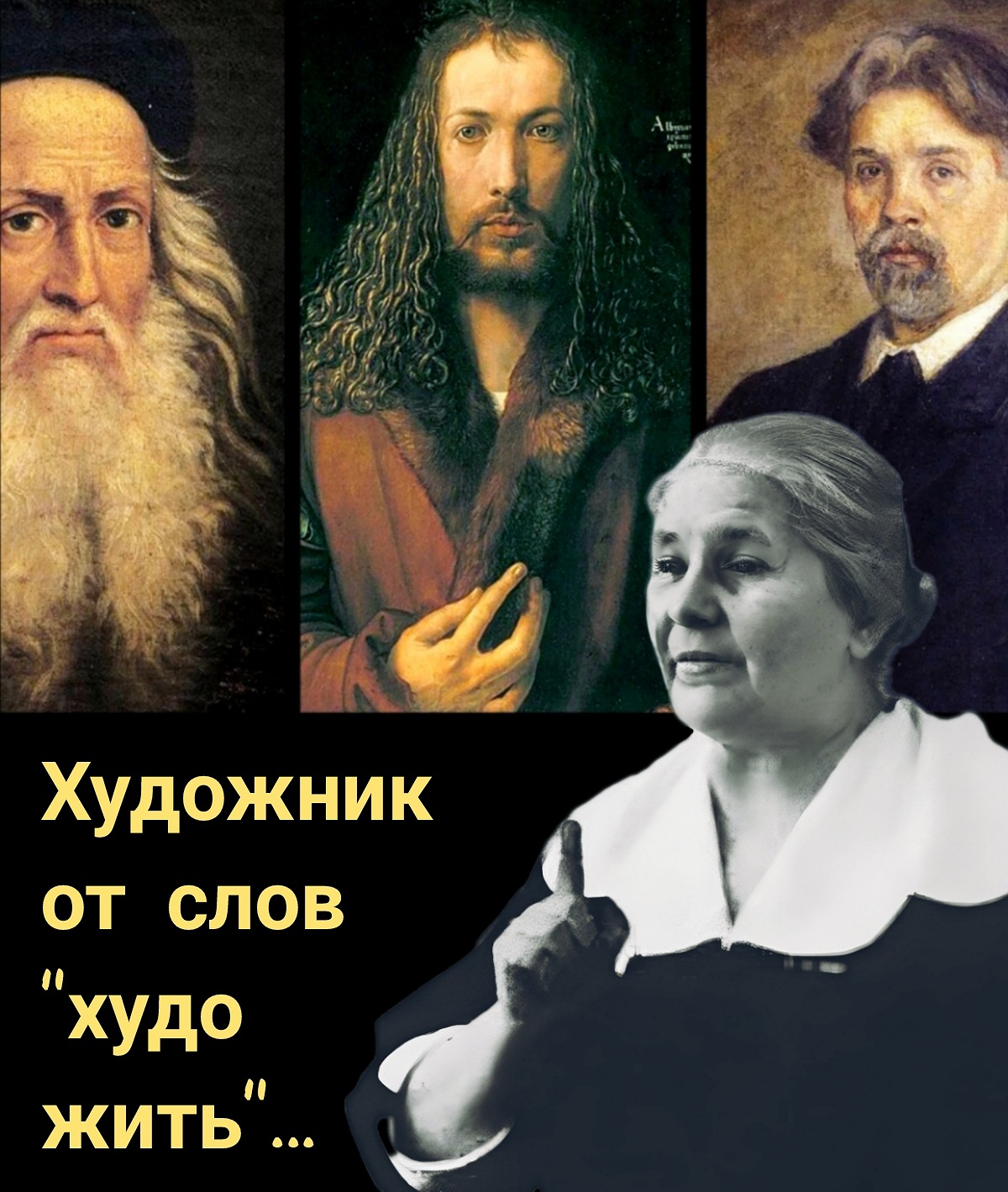 На картинке портреты Леонардо да Винчи, Альбрехта Дюрера, Василия Сурикова. Подпись: "художник от слов "худо жить". Пояснение: моя классная руководительница в средней школе однажды заявила, что слово художник произошло от слов худо жить. Это был камень в мой огород, так как она меня по неясной причине недолюбливала. Это к тому, что в мире существует немало людей далёких от искусства, — таким всё одинаково — что банный веник на стене, что музейный шедевр