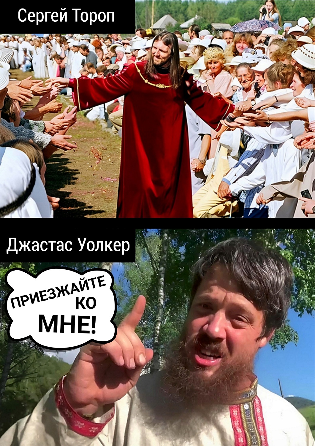 На картинке Сергей Тороп из Минусинска по прозвищу бог Виссарион и Джастас Уолкер. Подпись: "Приезжайте ко мне!"