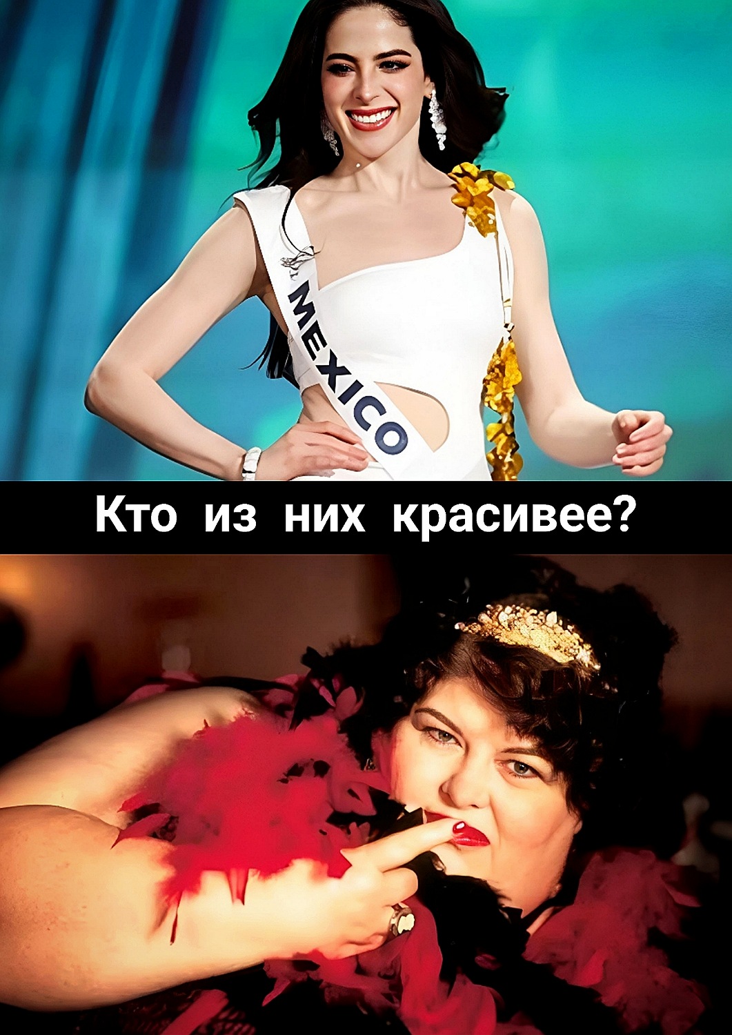 На картинке мисс вселенная 2025 и голливудская актриса Дарлин Кейтс. Подпись: "Кто из них красивее?" Пояснение: толстяки упорно считают себя самыми красивыми людьми на Планете