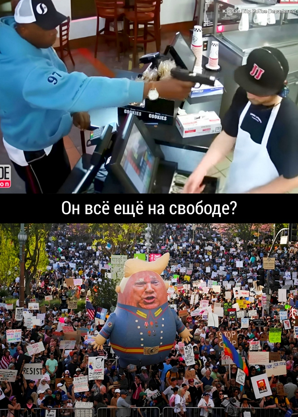 На коллаже грабитель магазина в США и митинг за свержение Дональда Трампа. Подпись: "Он всё ещё на свободе?"