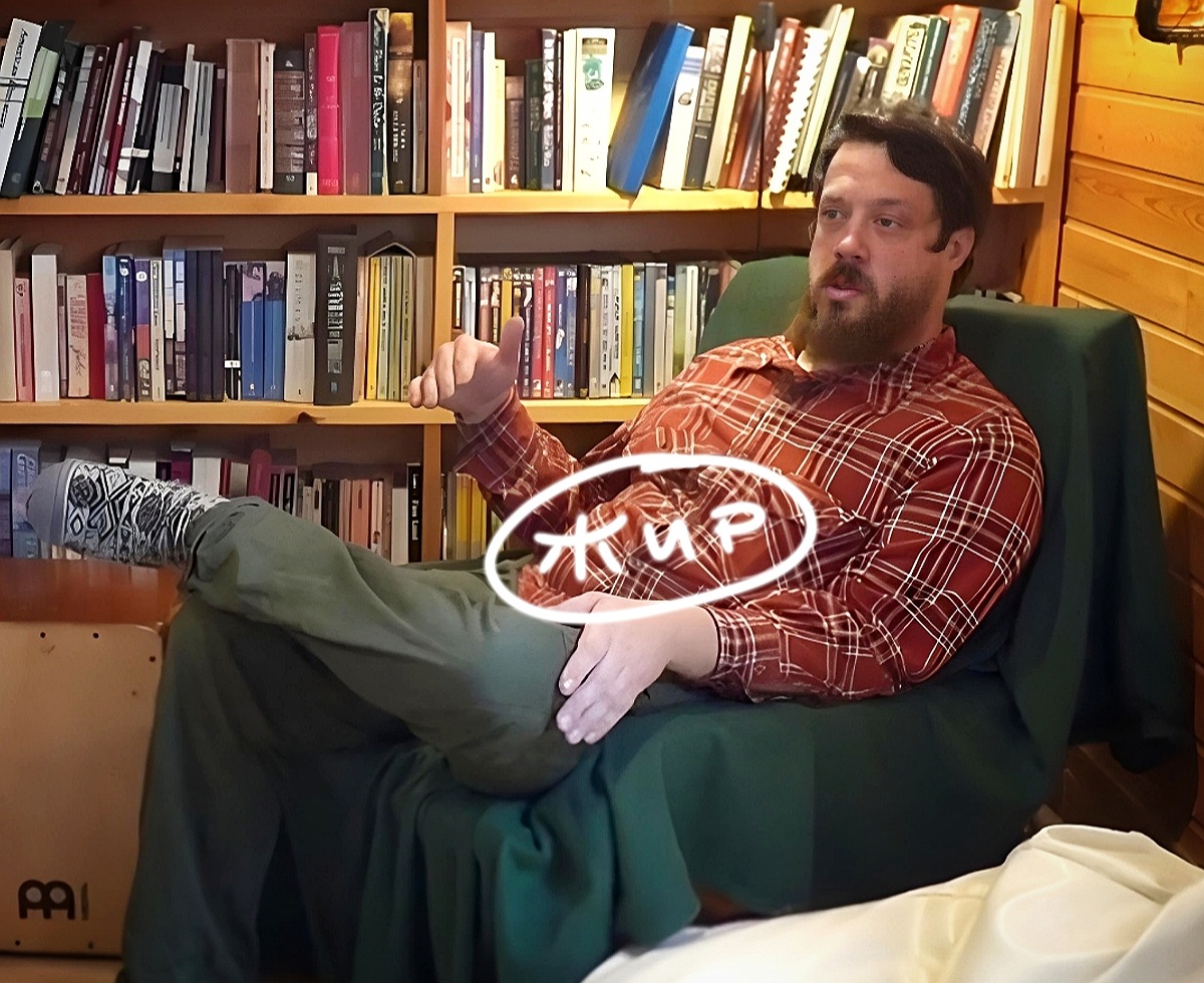 Скрин с видеоролика, подпись: "Жир". Пояснение: Джастас, живущий в своё удовольствие, давно уже превратился из "Весёлого молочника" в "Весёлого Мясоеда"