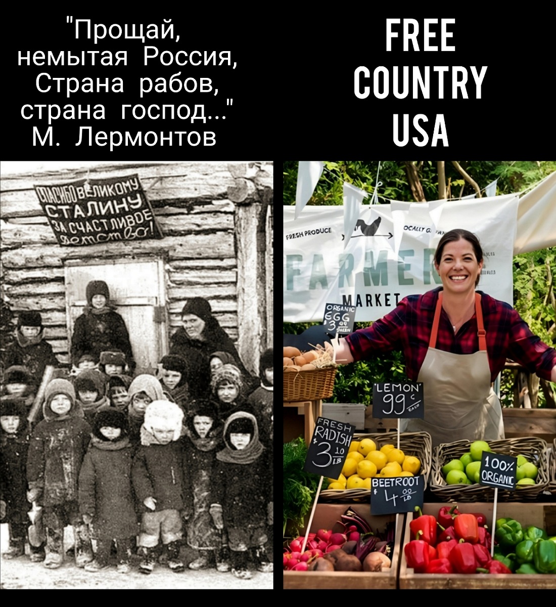 На картинке дети Норильска, 1937 год. Подпись: "Прощай, немытая Россия, Страна рабов, страна господ..." М. Лермонтов. Фермерская продукция на прилавке в США. Подпись: "free country USA"