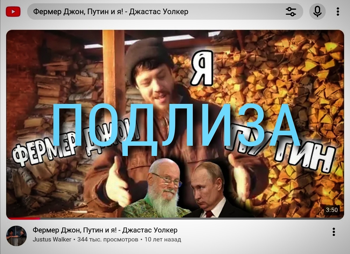 Скрин с видеоролика "Фермер Джон, Путин и я! — Джастас Уолкер". Подпись: "Подлиза"