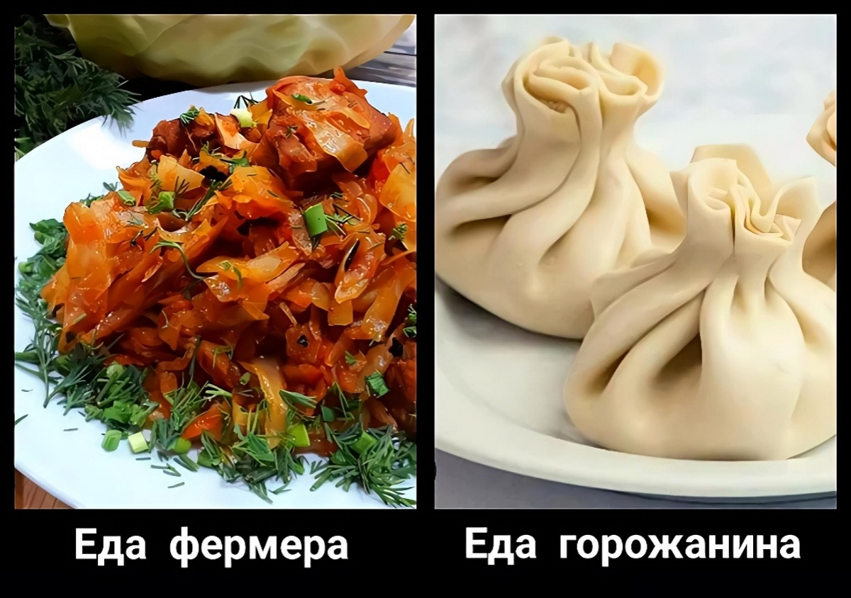 На картинке блюдо — бигус из капусты и хинкали. Подпись: "Еда фермера", "Еда горожанина"
