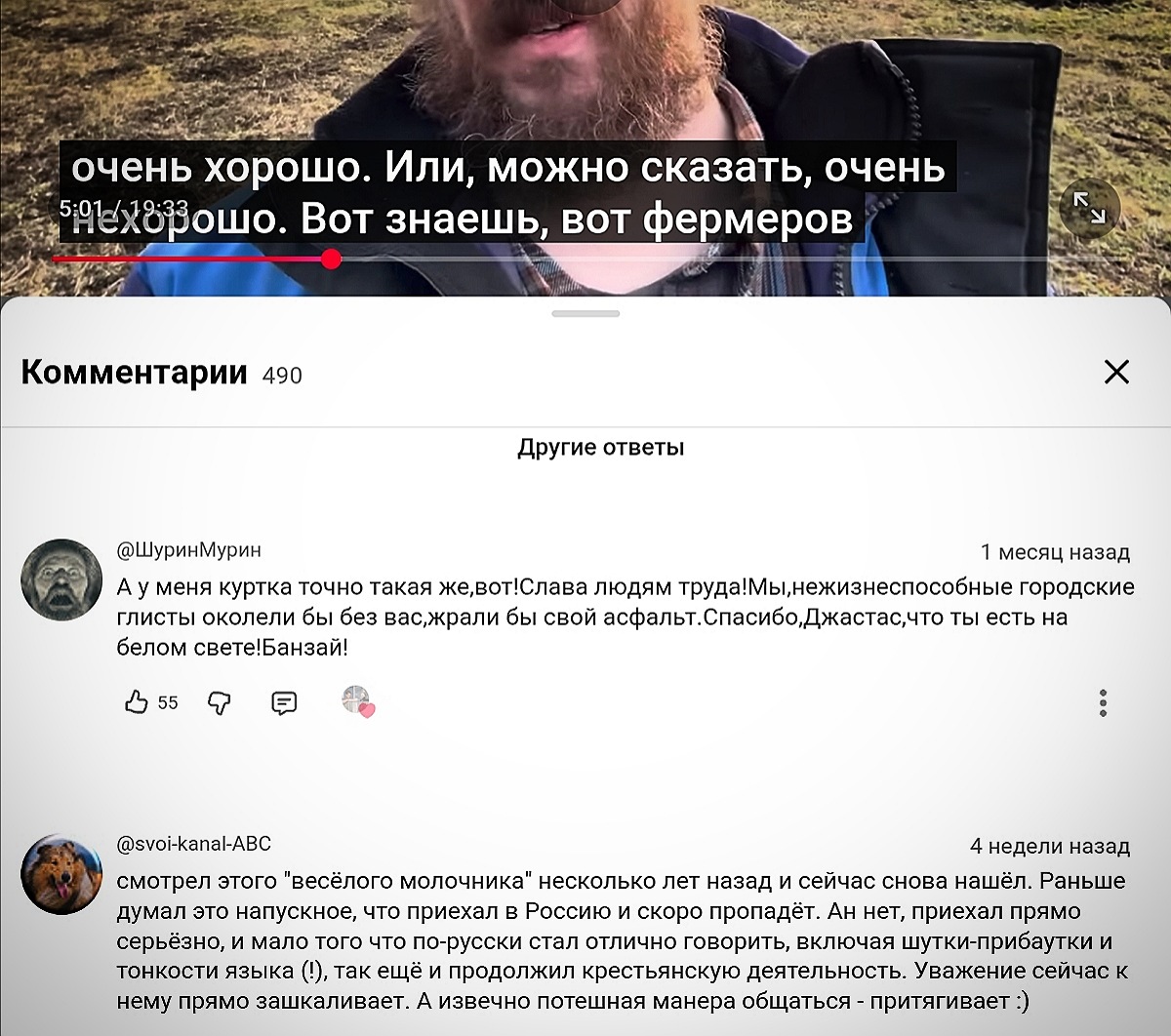Вернёмся от фермеров к блогерам. В одном из видео Джастас рассказал журналисту, что просыпается каждые 5 утра и идёт отвечать на комментарии подписчиков. Здесь видно невооружённым глазом, что блогер не отвечает, а просто перечитывает тысячи хвалебных слов, расставляя под ними сердечки.
