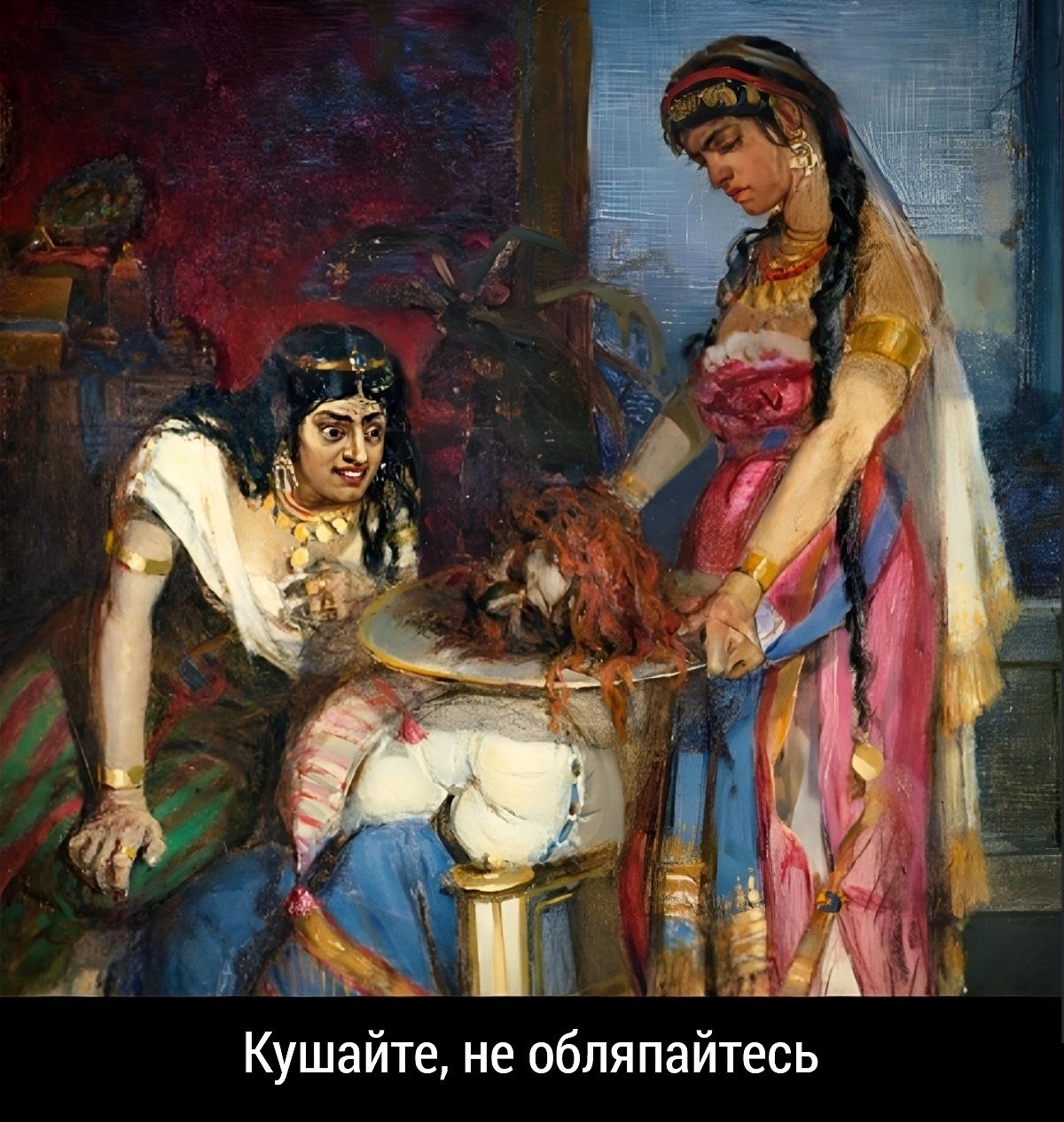 На картинке фрагмент картины В. Сурикова "Саломея приносит голову Иоанна Крестителя своей матери Иродиаде". Подпись: "Кушайте, не обляпайтесь"