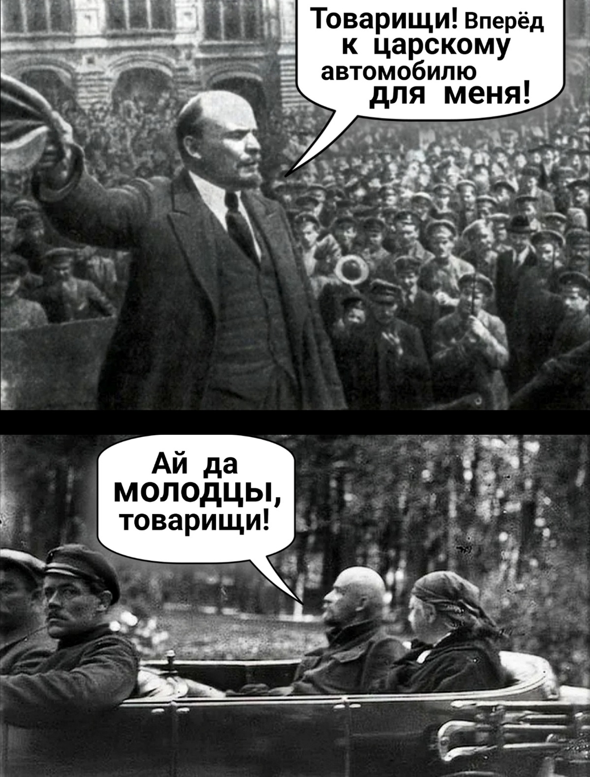 На картинке известный мошенник Ульянов. Подписи в диалоговых окнах: "Товарищи! Вперёд к царскому автомобилю для меня!"; "Ай да молодцы, товарищи!"