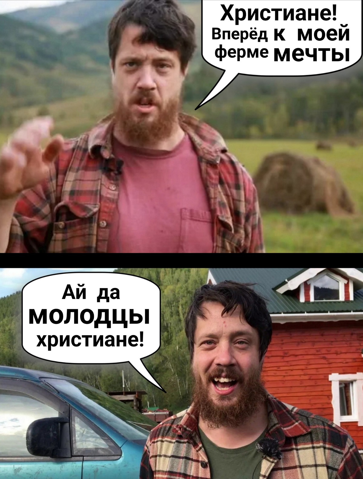 На картинке известный блогер Джастас Уолкер. Подписи в диалоговых окнах: "Верующие! Вперёд к моей Ферме Мечты!"; "Ай да молодцы, верующие!"