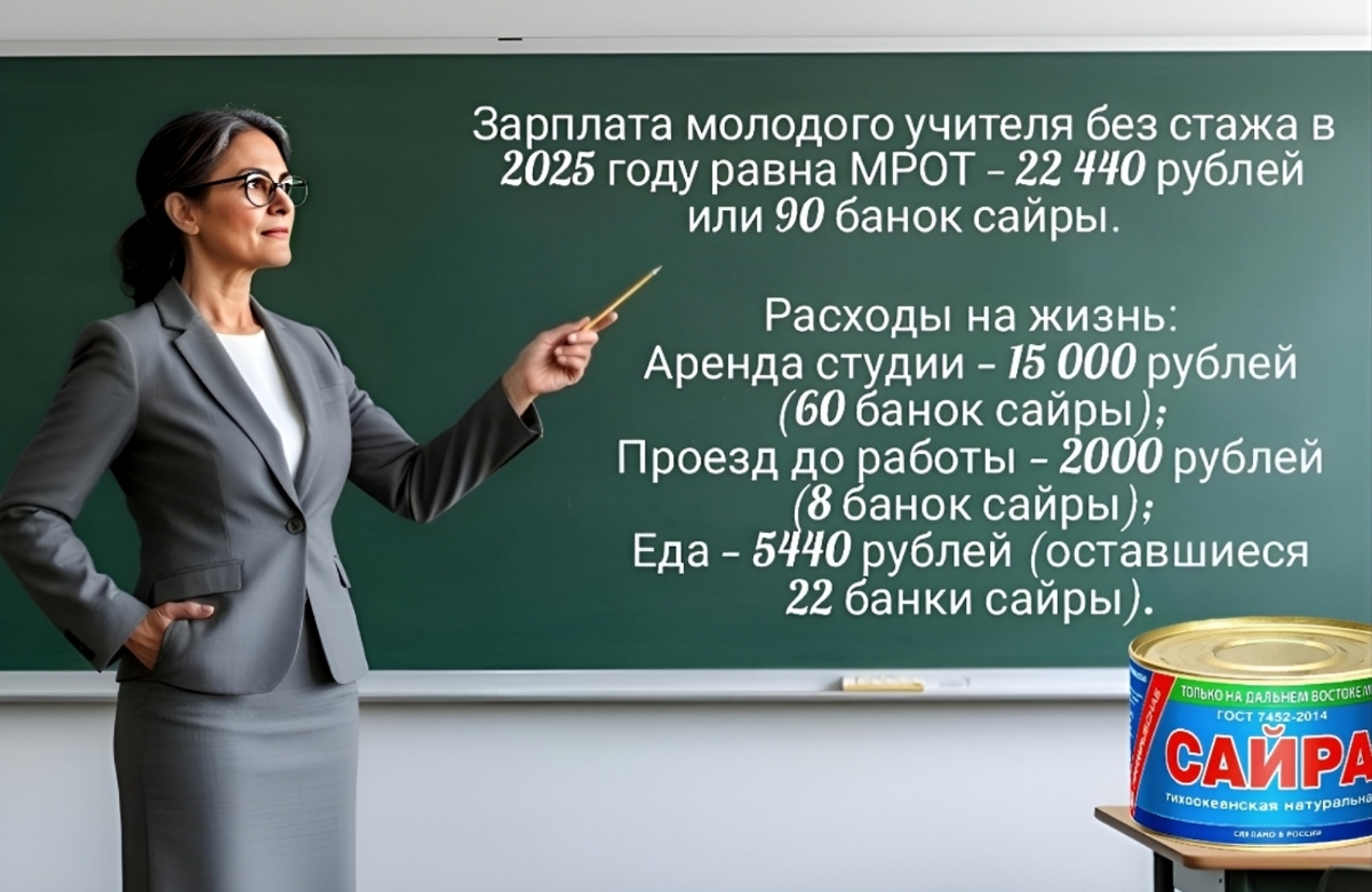 Сделано при помощи нейросети. На картинке подпись: "Зарплата молодого учителя без стажа в 2025 году равна МРОТ — ₽22.440 или 90 банок сайры. Расходы на жизнь: Аренда студии — ₽15.000 (60 банок сайры); проезд до работы — ₽2.000 (8 банок сайры); еда — ₽5.440 (оставшиеся 22 банки сайры)